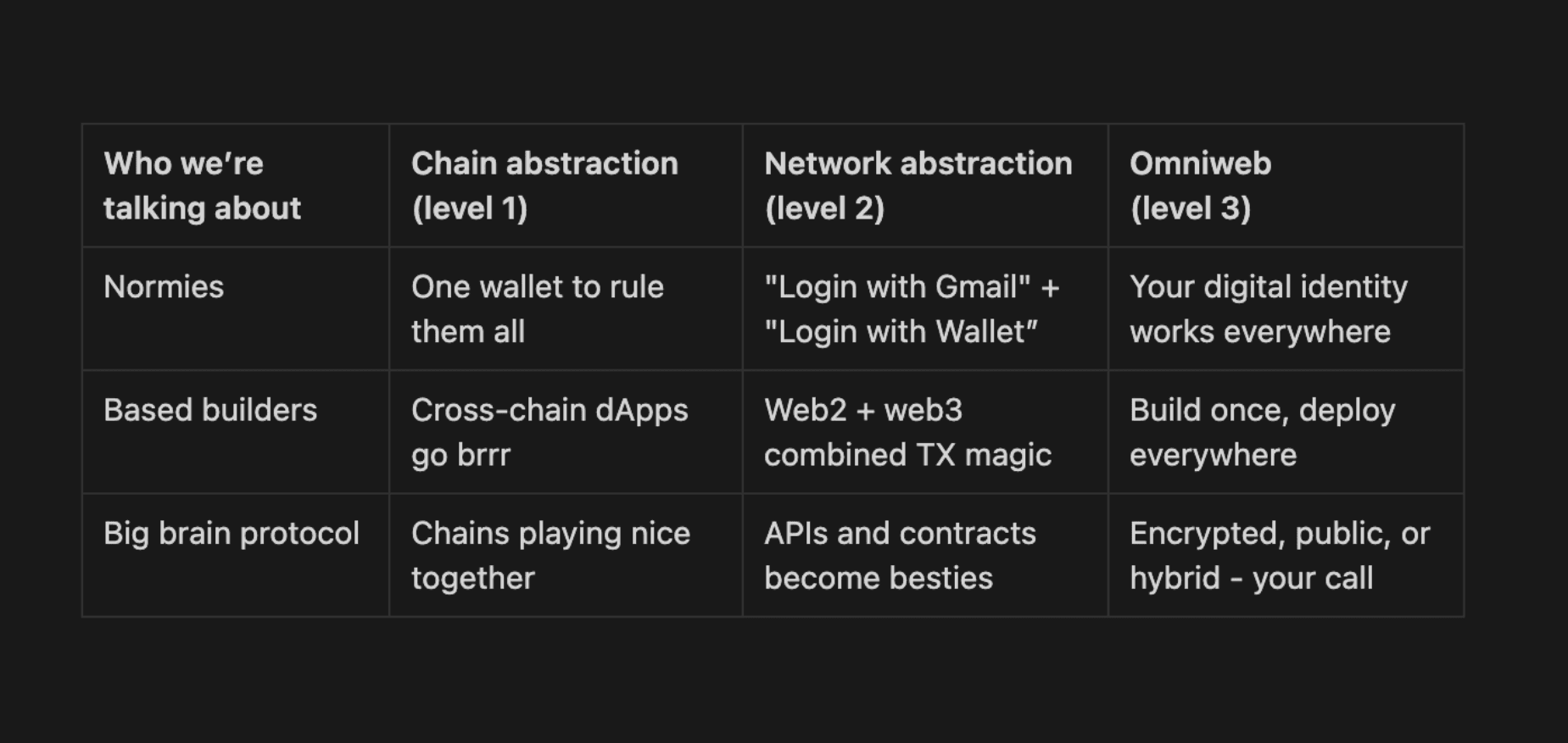 Instead of coping with partial solutions, we are building the whole ecosystem, the Omniweb, the final boss to reach the chain abstraction and network abstraction stratosphere. This isn't just another "ETH killer" or "Solana but faster" – this is next-level evolution.